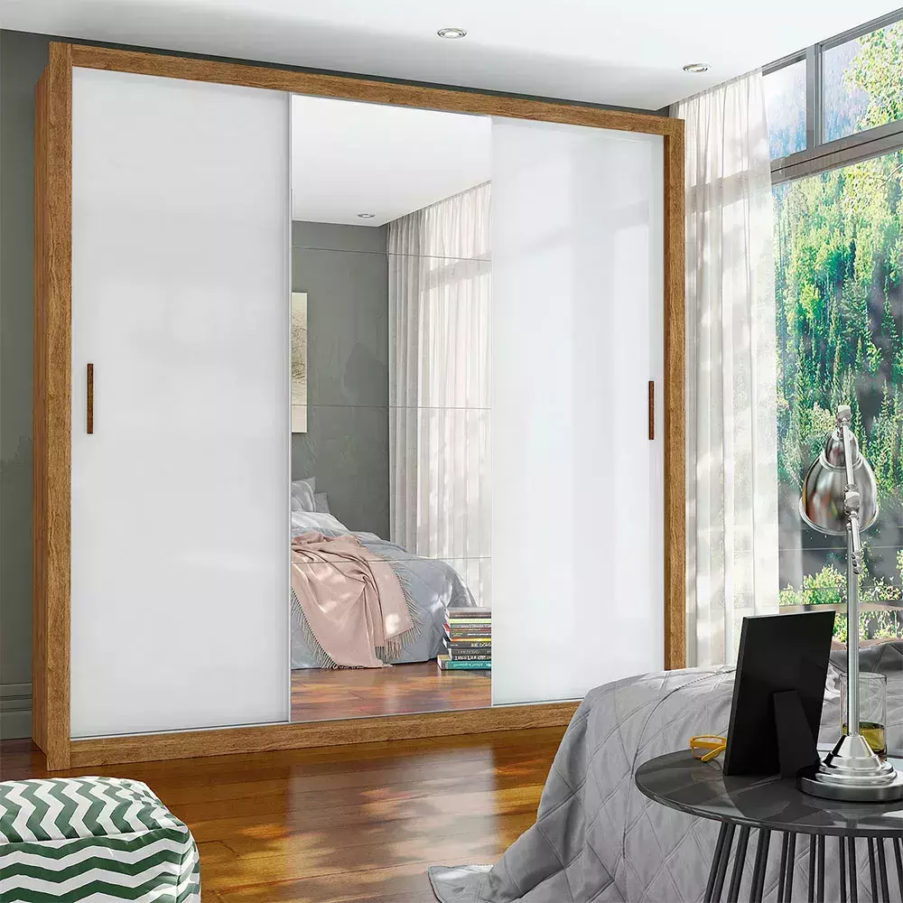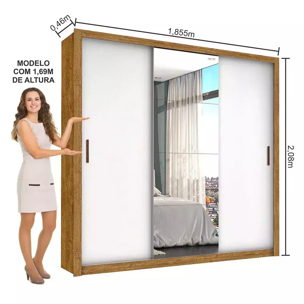 Guarda Roupa Conquista Plus com 3 Portas de Correr, acompanha 4 espelhos na porta do meio, pés que além de serem funcionais, trazem a sensação de amplitude, principalmente em ambientes menores.